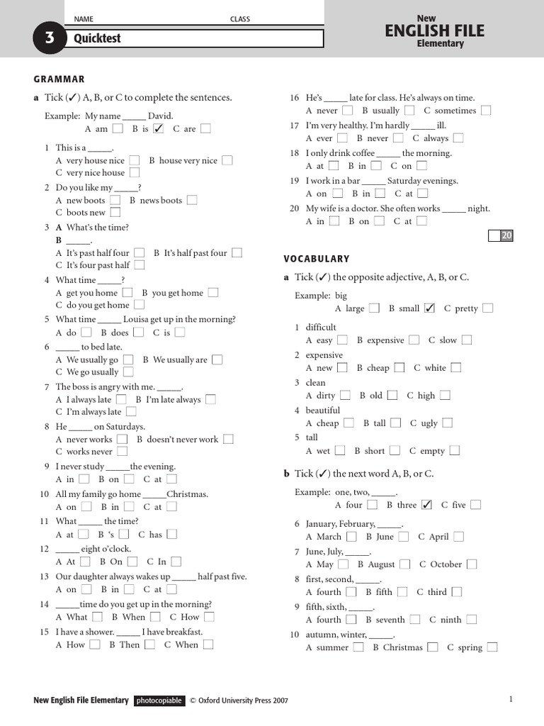 Nef Elem Quicktest 05 Name 5 New Class English File Quicktest Elementary G R Am Mar A Tick A B Or C To Complete The Sentences Example My Name David A Course Hero